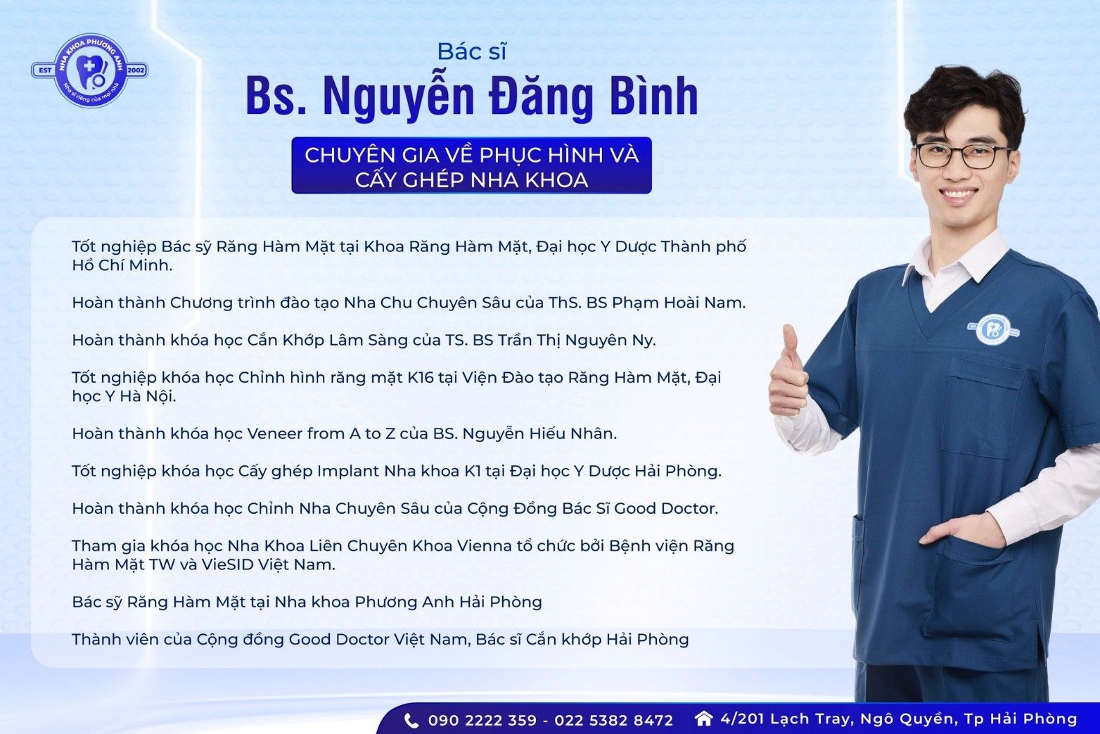 Bác sĩ Nguyễn Đăng Bình: Là thế hệ kế thừa tại Nha khoa Phương Anh – nơi gắn liền với tâm huyết của bác sĩ Phương Anh, bác sĩ Nguyễn Đăng Bình không chỉ tiếp nối chuyên môn và truyền thống gia đình mà còn thổi vào đó tinh thần đổi mới, sự nhạy bén với công nghệ và tư duy điều trị hiện đại. Tốt nghiệp Bác sĩ Răng Hàm Mặt tại Đại học Y Dược TP. HCM, bác sĩ Đăng Bình tiếp tục không ngừng cập nhật và nâng cao kiến thức với các chương trình đào tạo chuyên sâu.