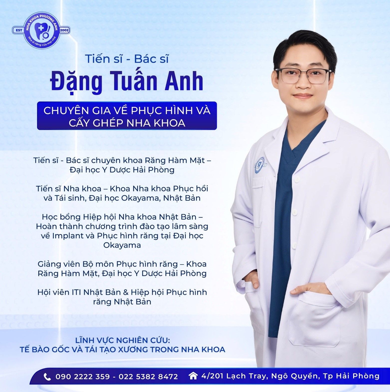 Tiến sĩ – Bác sĩ Đặng Tuấn Anh: Là chuyên gia trong lĩnh vực phục hình răng và cấy ghép Implant, với nền tảng chuyên môn vững chắc và nhiều năm nghiên cứu chuyên sâu.
